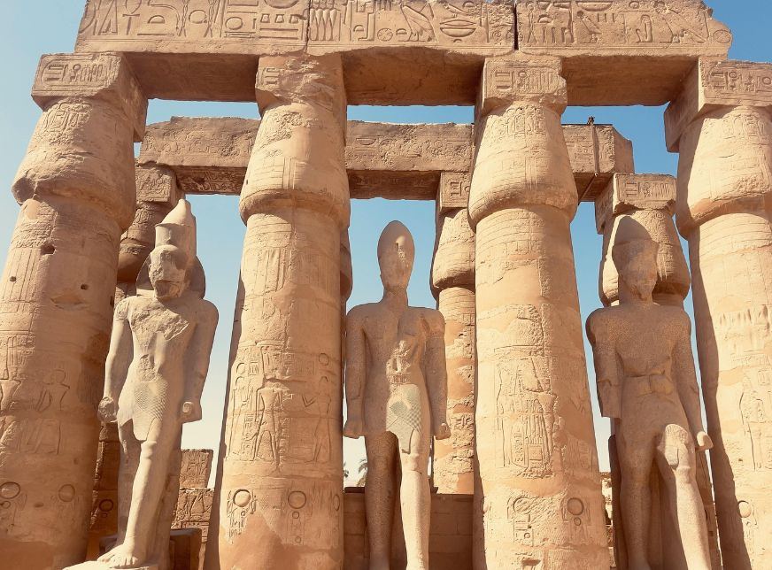 Two massive stone statues of King Amenhotep III are the only remains of a complete mortuary temple. The statues are made from blocks of quartzite sandstone which exist in Luxor