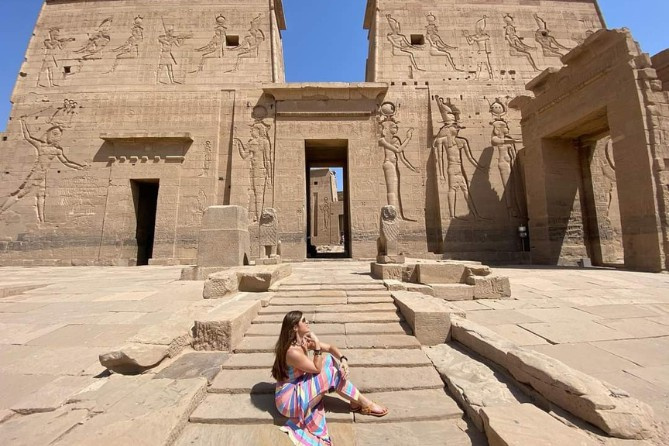 اليوم ستزور المعالم السياحية في أسوان، بما في ذلك معبد فيلة، وجولة بالفلوكة حول الفنتين والسد العالي والمسلة غير المكتملة.