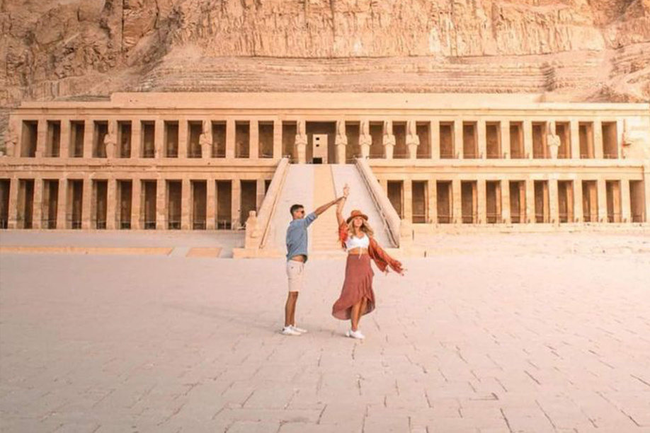Aus der Wüstenebene erhebt sich terrassenförmig der Tempel der Hatschepsut Mergs, eingebettet in die steilen Kalksteinfelsen der Ostseite des Thebanischen Gebirges – als hätte die Natur selbst dieses außergewöhnliche Monument geschaffen.