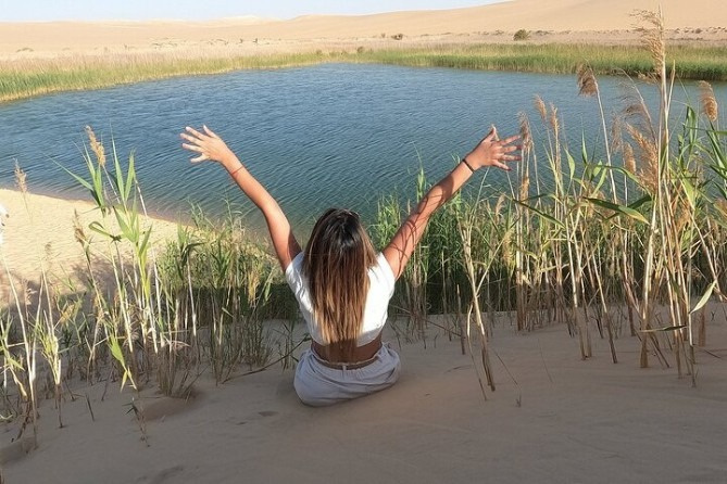 Luego te aventurarás en el desierto descubriendo el Gran Mar de Arena. en jeep 4x4, visite la fuente fría y caliente Bir Waheed. Más tarde, disfrutaremos de un té beduino tradicional al atardecer y pasaremos la noche en el campamento del desierto y disfrutaremos de una cena de barbacoa. Si necesita dormir en un hotel en lugar del campamento, esto también está disponible. Tenemos buenos alojamientos ecológicos en Siwa.
