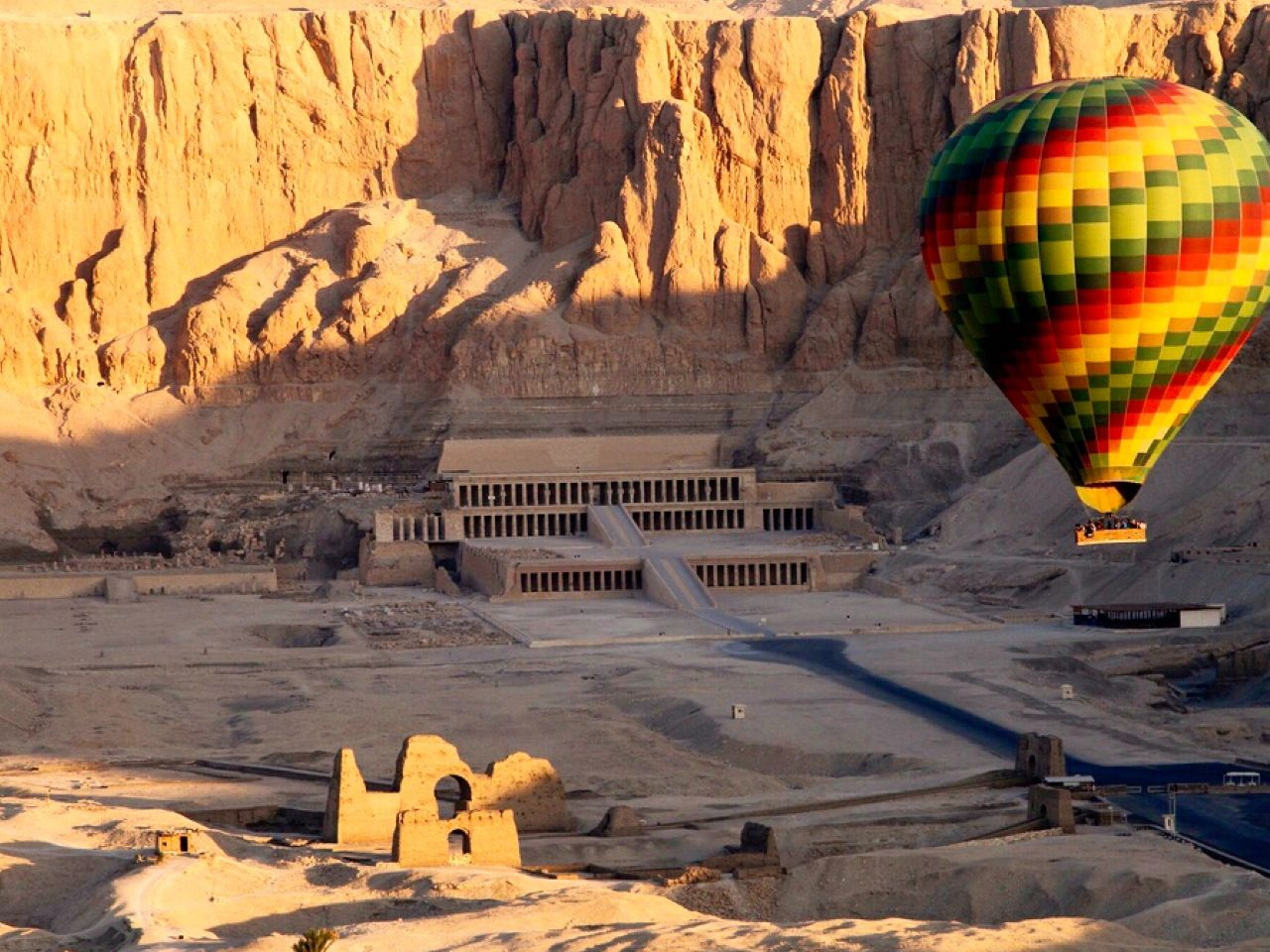 S'élevant de la plaine désertique, dans une série de terrasses, le temple d'Hatchepsout se confond avec les falaises calcaires abruptes de la face orientale de la montagne thébaine comme si la nature elle-même avait construit ce monument extraordinaire :