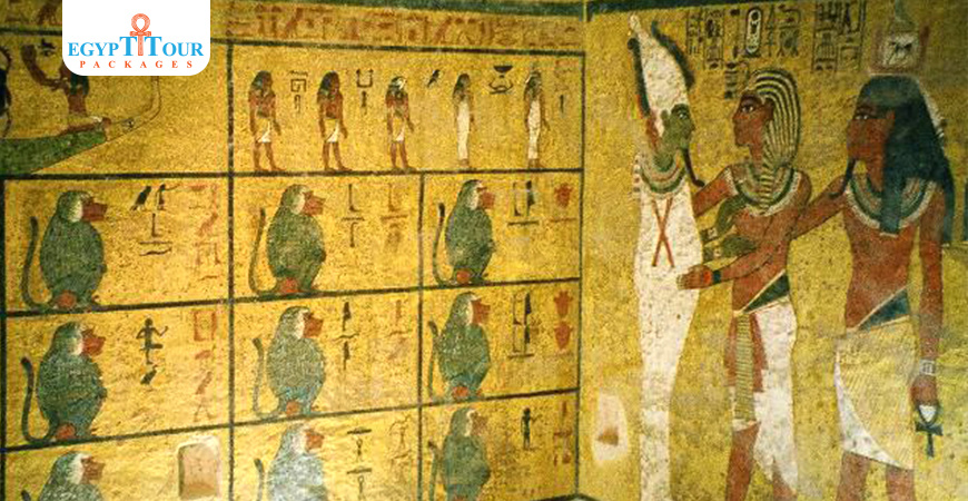 a. Wewnątrz trumny Carter znalazł około 150 zdobionych naszyjników i welonów. Obok dużej szafy znaleziono 11 drewnianych wioseł do łodzi słonecznej. Znaleziono również naczynia zawierające kadzidło i perfumy oraz pięknie zdobione lampy oliwne. Bóg Hapi, bóg Nilu. Kiedy Carter wszedł do pokoju z trumnami, znalazł dużą pozłacaną szafę wypełniającą całe pomieszczenie, z innymi szafami i trumnami w środku. Aby Carter mógł usunąć trumnę z pokoju, musiał zburzyć południową ścianę między pomieszczeniami z trumnami a pokojem przednim. -dekoracje komory sarkofagowej Ściany komory sarkofagowej zdobią sceny z Księgi Umarłych (zwrócone zgodnie z ruchem wskazówek zegara), scena ceremonii otwarcia ust, sceny z Księgi Życia Pozagrobowego (umarłych) oraz kilka scen przedstawiających spotkanie