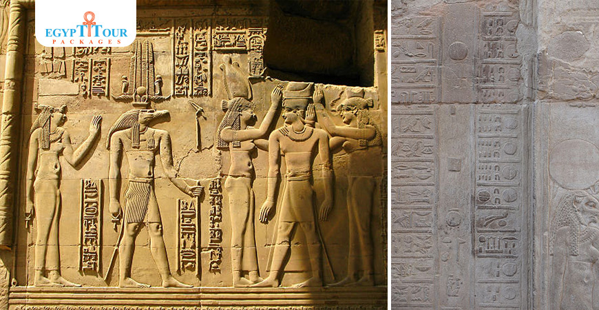 Inscripţiile templului, începând de la a doua sală hipostilă până la capăt: - Începând de la a doua sală hipostilă, vedem pe peretele din stânga o vedere din exterior. Este cunoscut ca element decorativ, care este legătura dintre semnele Ankh, Geid și Was între ele și este un element decorativ cunoscut în templele ptolemeice. În ceea ce privește interiorul, există o vedere a lui Sobek pe pictura murală care leagă porțile Sobek și Horus din interior. Putem spune că majoritatea scenelor din Sala a II-a Hipostilă sunt dominate de scene ale încoronării regale, dar cele mai importante vederi sunt următoarele: O scenă reprezentând regele în picioare și ținând în mâini semnul lui Was în fața lui. idolul Horus, care la rândul său îi prezintă lui Siddad semnul iubirii. Observăm că semnul se termină cu trei broaște care indică numărul de mulți ani. Ceea ce este nou în această scenă este reprezentarea regelui împreună cu soția sa principală și secundară și este o scenă care nu se găsește în niciun temple egiptene. Înainte de asta, ambele soții țineau baghete în mâini, poate un semn al căsătoriei. Sunt vederi ale următoarelor trei săli: Cele trei săli sunt dominate de scene de jertfe Cu toate acestea, cele mai importante vederi ale acestor săli sunt următoarele: Cea mai importantă vedere din prima sală: - O vedere a regelui cu dubla coroana, în picioare cu semnul lui Was, cu zeița Seshat (ea este cunoscută a fi zeița scrisului și se crede că este soția lui Jehuti, zeul înțelepciunii și scris în Egiptul antic). Cea mai importantă vedere din a doua sală: O vedere reprezentând calendarul și zilele anului, iar tabelul de zile corespunde unui alt tabel corespunzător acestuia, astfel încât fiecare zi din tabel să corespundă unei acțiuni care îi corespunde în altă masă. Cea mai importantă vedere din sala a treia: - Reprezentarea regelui cu Sfânta Eneada.