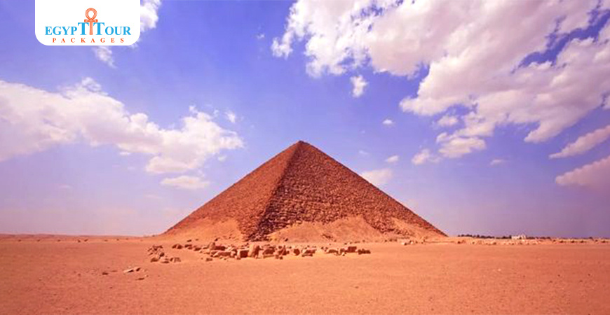 The The Red Pyramid, also called the North Pyramid, is the largest of the pyramids located at the Dahshur necropolis in Cairo, Egypt. Red Pyramid , also called the North Pyramid, is the largest of the pyramids located at the Dahshur necropolis in Cairo, Egypt. Named for the rusty reddish hue of its red limestone stones, it is also the third largest Egyptian pyramid, after those of Khufu and Khafre at Giza. It is also believed to be Egypt's first successful attempt at constructing a "true" smooth-sided pyramid. Local residents refer to the The Red Pyramid, also called the North Pyramid, is the largest of the pyramids located at the Dahshur necropolis in Cairo, Egypt. Red Pyramid as (el-heram el-watwaat), meaning the Bat Pyramid. The The Red Pyramid, also called the North Pyramid, is the largest of the pyramids located at the Dahshur necropolis in Cairo, Egypt. Red Pyramid was not always red. It used to be cased with white Tura limestone, but only a few of these stones now remain at the pyramid's base, at the corner. During the Middle Ages much of the white Tura limestone was taken for buildings in Cairo, revealing the red limestone beneath. The The Red Pyramid, also called the North Pyramid, is the largest of the pyramids located at the Dahshur necropolis in Cairo, Egypt. Red Pyramid was built by the Pharaoh Sneferu, who reigned from 2613 to 2589 BC. Construction is believed to have begun in the thirtieth year of Sneferu's reign (c. 2590 BCE). Egyptologists disagree on the length of time it took to construct, with estimates ranging from 10 to 20 years. The The Red Pyramid, also called the North Pyramid, is the largest of the pyramids located at the Dahshur necropolis in Cairo, Egypt. Red Pyramid is 104 meters tall and has a base side length of 230 meters. It is made of limestone and granite, and its original casing of white limestone has been eroded away over time.