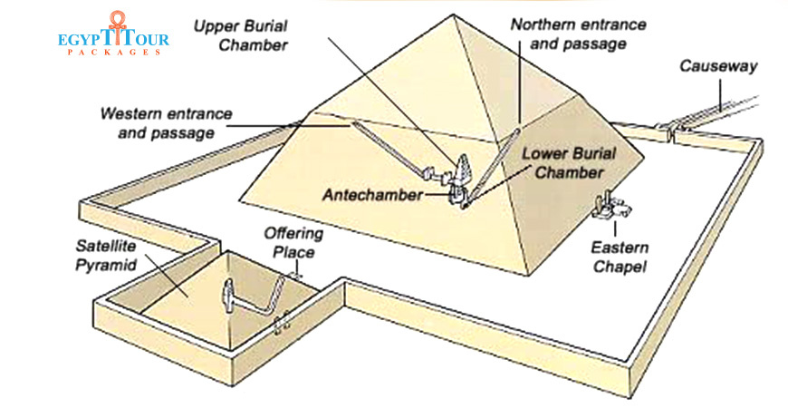 The internal structure of the The Bent Pyramid, constructed by Pharaoh Sneferu during the Old Kingdom, is an ancient Egyptian pyramid situated in the royal necropolis of Dahshur. Bent Pyramid is as innovative as the pyramid itself. Unlike any other pyramid, there are two internal structures: with entrances in the North and West sides. From the north, a passage descends down to an antechamber. In order to deal with the downward pressure of the pyramid on this chamber, its roof was made of different courses, with each course projecting more inwards than the course below. This technique, known as corbelling, was also used for the pyramid at Meidum. The burial chamber, also with a corbelled roof, is located above the antechamber. The second entrance, in the West face of the pyramid, lead down via a descending passage to a horizontal corridor which was intended to be blocked by some portcullis slabs. The second burial chamber, behind these portcullises, also has a corbelled roof. It is at a higher level than the first burial chamber. Scaffoldings of cedar beams were intended to give the room some additional support. After they were completed, the two burial chambers were connected by a passage that was cut out through the existing masonry. It is not known why Sneferu wanted to have two burial chambers in this pyramid, but perhaps this too can be explained by the clear experimental nature of this monument.