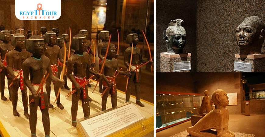 The museum includes many statues of kings and individuals, some mummies of the ram, the symbol of the god Khnum, various types of pottery, architectural and decorative elements, a number of coffins, daily life tools, and some funerary paintings. In recent years, the German mission excavating in Elephantine, in cooperation with the Supreme Council of Antiquities, created an annex to the ancient museum located to the north of it and includes some of the antiquities that the mission found during its excavations that took place for many years on the island. The museum also includes a garden, caves engraved with rock engravings, minarets in the Islamic style, a Nubian house surrounded by a lake, the temple of the goddess Sett, the temple of Haqqaib, and a Nile scale.