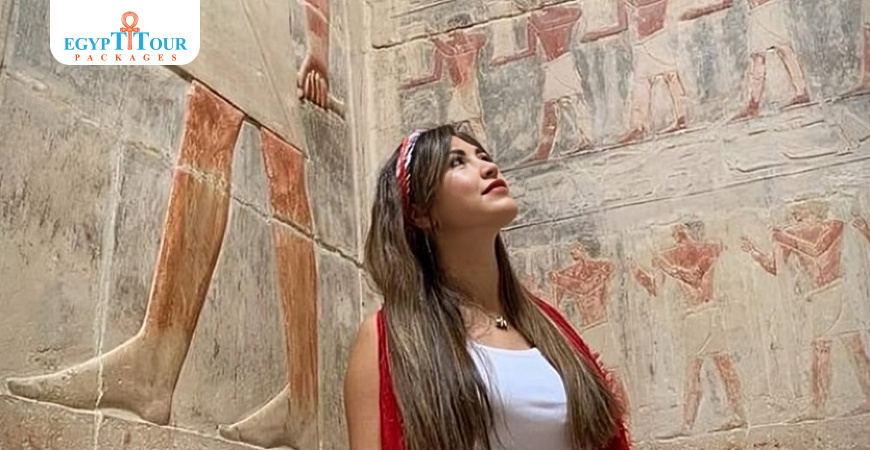 Kagemni's tomb can be accessed from the east and has a similar appearance to Mereruka's tomb. The entrance jambs display a double representation of Kagemni, providing his names and titles. Upon entering, Kagemni is depicted as being overweight. The tomb consists of eight chambers adorned with exquisite reliefs, along with five storage rooms. Unfortunately, the colors on the decorated walls are not as well-preserved as those in Mereruka's tomb. The first chamber contains remnants of a scene depicting fishing and fowling in the marshes, with Kagemni standing in a papyrus boat.