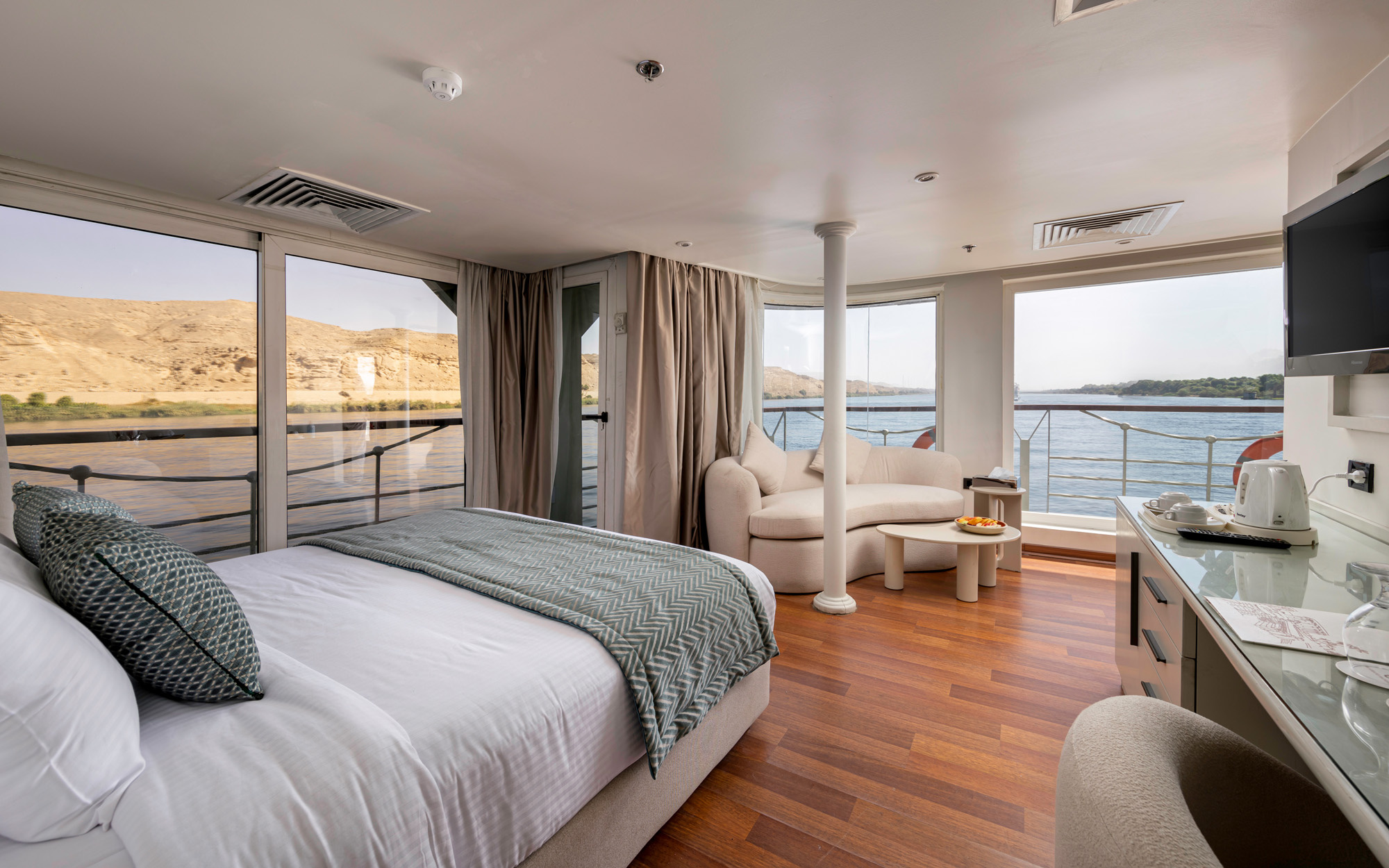 Located at the front of the boat on the middle deck, the Royal Suites offer an exclusive and spacious retreat with breathtaking views of the Nile. Each suite is elegantly designed and features a flat-screen TV, an internal telephone system, air conditioning, a safe box, and a minibar with a tea and coffee tray for added comfort. A distinctive lounge area sits in front of the panoramic windows, which follow the curvature of the room, allowing guests to enjoy an uninterrupted, wide-angle view of the river. The en-suite bathroom is fitted with a large shower cabin featuring hanging rain shower nozzles, along with a hairdryer, a makeup mirror, and a selection of high-end branded skincare and hair products, ensuring a truly luxurious experience. Please specify the preferred bedding configuration when booking. Bed choices are subject to availability.