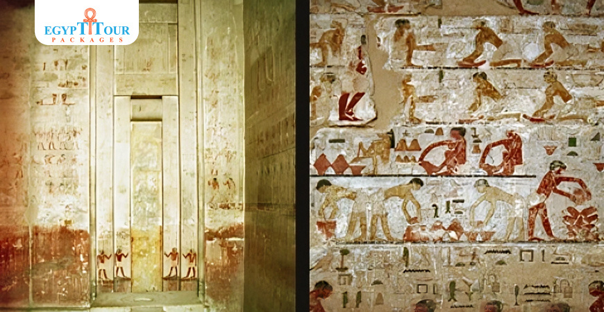 During this time, just like other tombs, people would enter through a portico on the northern side. Inside, there is a large courtyard with twelve square pillars and a burial shaft in the center. This burial shaft is where Ti's empty sarcophagus was discovered. Unfortunately, not much remains of the courtyard's decoration today. However, there is an opening into the first statue chamber in the northeast corner. The courtyard still has reliefs depicting Ti in agricultural scenes and scenes of daily life. In the southwest corner of the courtyard, there is a false door stela belonging to Ti's son, Demedji. A small, adorned hallway guides to two chambers and a fake door belonging to Ti's wife, Neferhetpes, who served as a Priestess of Neith and Hathor, can be observed on the right side of the passage. Continuing down the right side, there is a lengthy, slender chamber adorned with vibrant reliefs depicting the process of food preparation, such as cooking and brewing, as well as pottery production. Additionally, there are scribes depicted recording these activities.