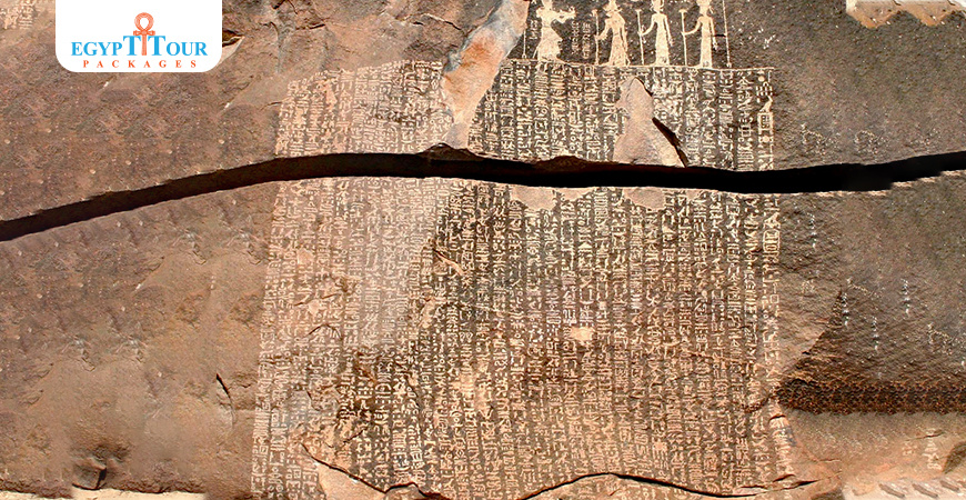 The Famine Stela is inscribed in 32 vertical rows of hieroglyphic script, with a scene above it depicting King Djoser (2686–2667 BC) presenting offerings to the divine triad of Elephantine consisting of the god Khnum, his wife Satet and their daughter Anuket. The country is gripped in seven years of drought and famine and King Djoser summons his famous courtier, the wise Imhotep to find a solution. Imhotep told the king that the inundation came from the sacred spring in The island of Elephantine is one of major Aswan attractions floating on the Nile. The island in 12000 meters situated in the center of the Nile. Elephantine Island , whose god Khnum was the one who controlled the flow of water. Djoser dutifully made offerings to the gods of Elephantine and Khnum appeared to him in a dream one night, promising him to end the famine by returning the flood. To celebrate the return of prosperity, Djoser built a temple on Elephantine to thank Khnum.