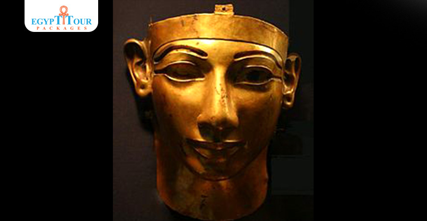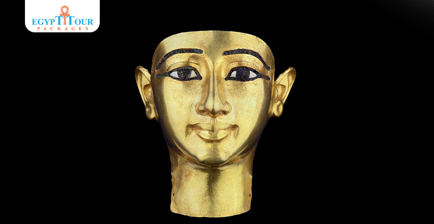 The death mask of Shoshenq II was found on the king’s mummy but was seriously damaged. It is made from a thick sheet of gold with hollow spaces for the eyes and the eyebrows where glass paste was to be inserted.The gold mask was fixed to the mummy by five small perforated tenons three on the forehead and two below the ears. The facial features depict the king as a young man in accordance with Egyptian artistic traditions indicating that the deceased is to be resurrected at this young age.Shoshenq II was the only ruler of the 22nd Dynasty whose tomb was not plundered by tomb robbers.His final resting place was discovered within an antechamber of Psusennes I’s tomb at