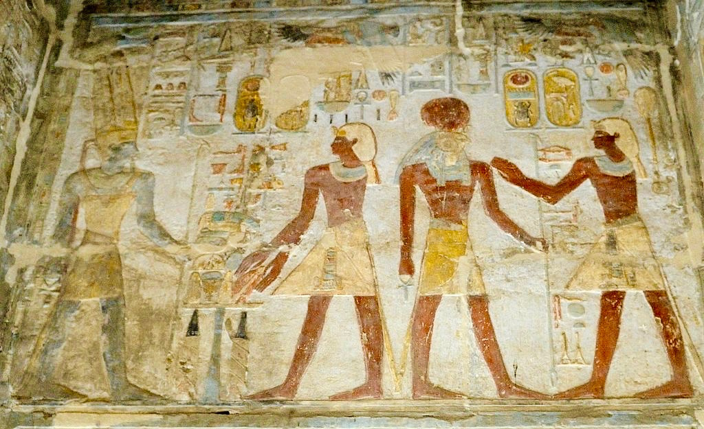 The walls of the The Temple of Amada is an ancient Egyptian temple located in Nubia, about 180 kilometers south of Aswan. It was built during the 18th Dynasty. Temple of Amada are decorated with reliefs and inscriptions that depict scenes from Egyptian mythology and history. The reliefs are particularly well-preserved, as they were covered with a layer of plaster when the temple was converted into a Christian church in the 6th century AD. The finest painted reliefs are in the innermost section of the temple where Thutmose III and Amenhotep II are shown being embraced or making offerings to various Egyptian gods. The left-hand side of the vestibule shows Amenhotep II being crowned by Horus and Thoth and running with an oar. and A fine and brightly colored relief of the kings Thutmose III and Amenhotep II before the gods at Amada Temple in Nubia.
