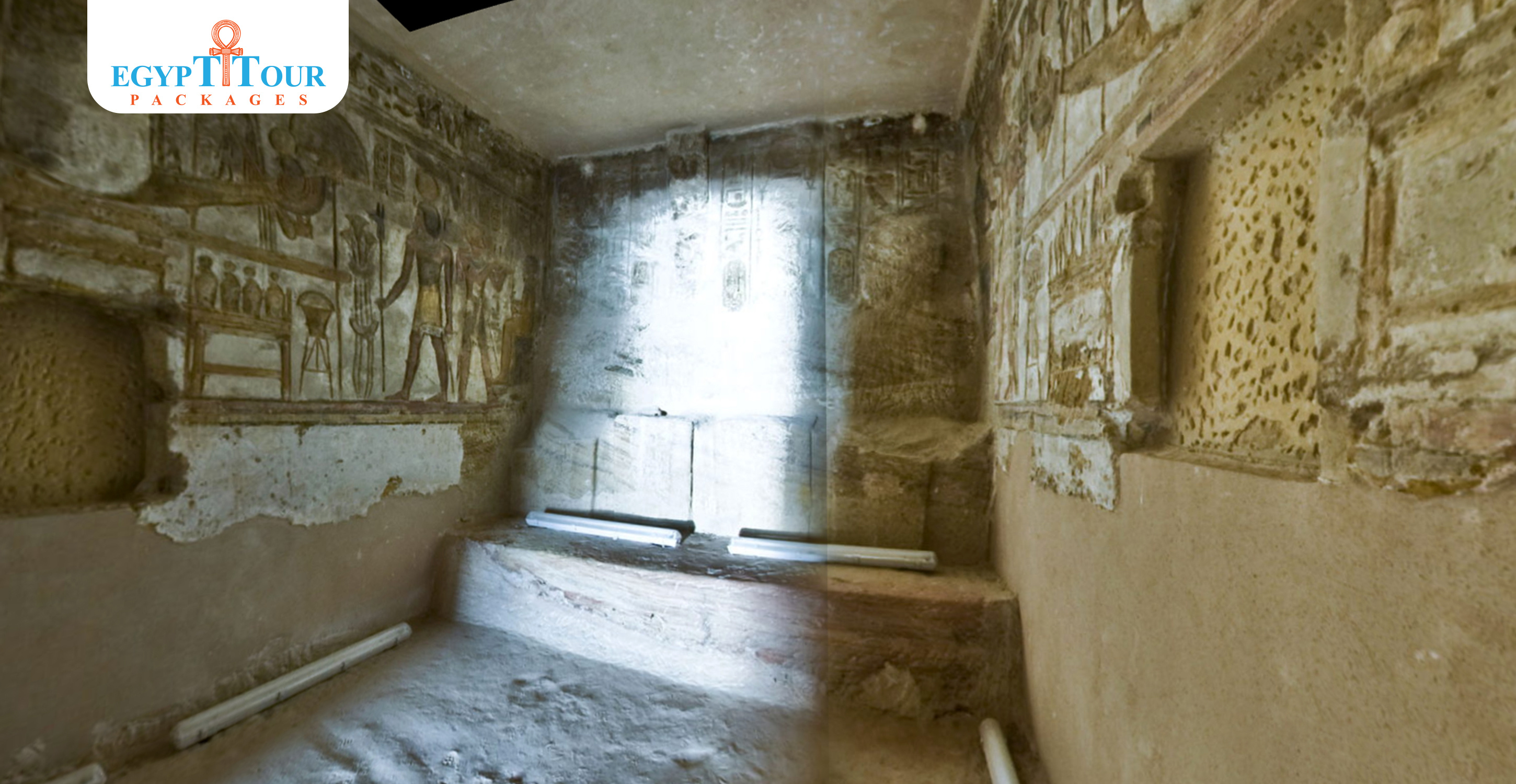 The sanctuary, which includes four statues leaning on the back wall, representing Ra, Hor-Akhty, King Ramesses II, Amun-Ra, and Ptah. On either side of the sanctuary, there are two rooms used to store tools used in rituals. There are scenes in this room of the offering, the king in front of the holy boat, the burning of incense, and other scenes.