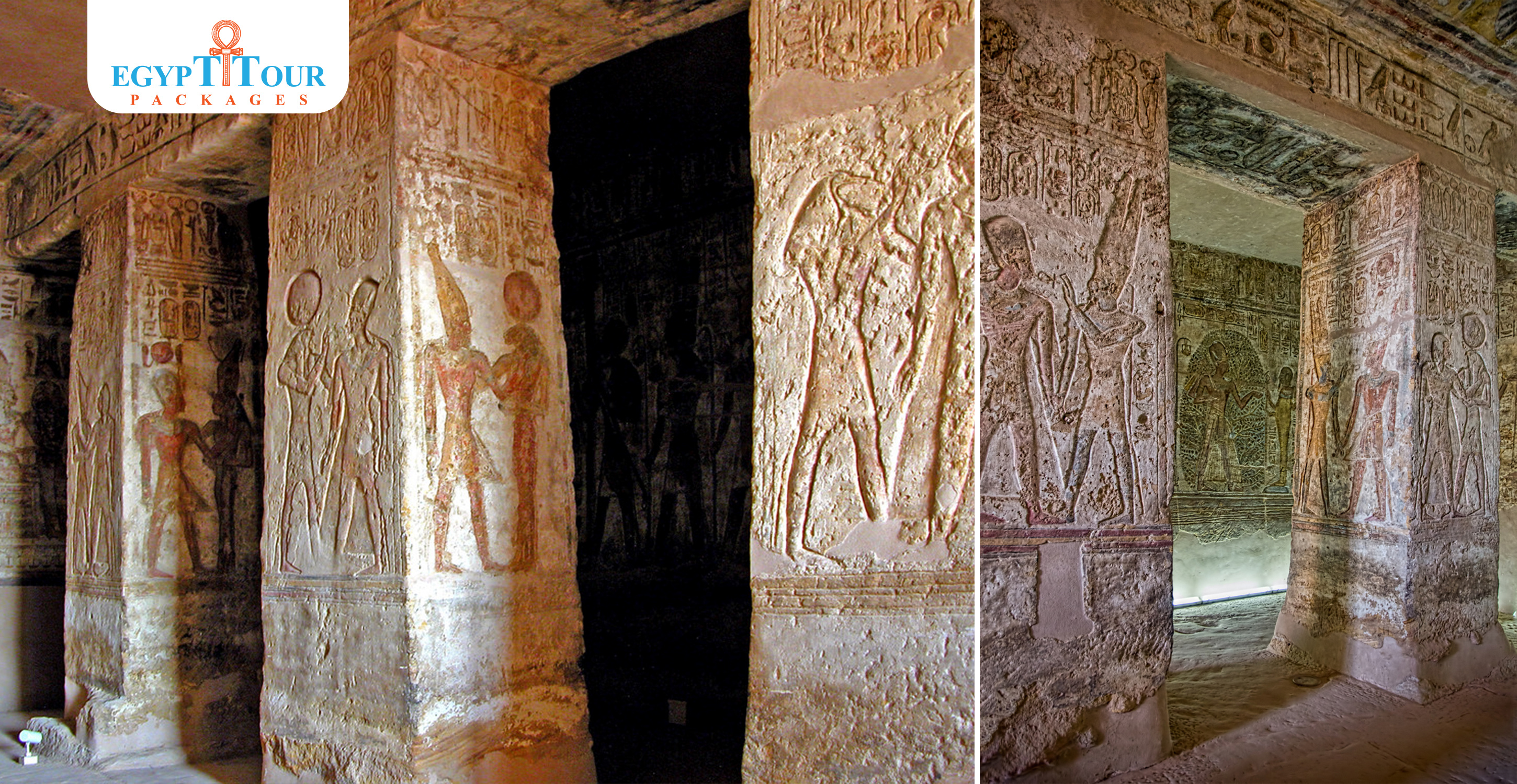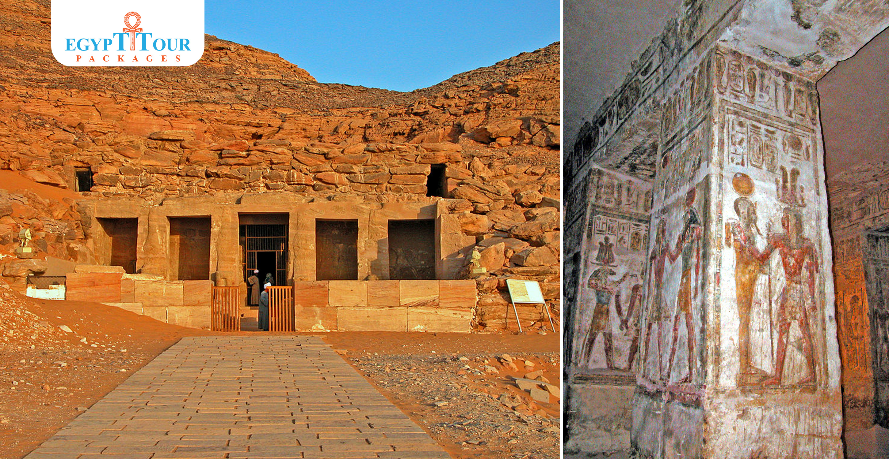 , temple cut into the rock was commissioned by the great 19th Dynasty king Rameses II. Its ancient Egyptian name was ‘The Temple of Rameses the Beloved of Amun in the Domain of Ra’. Essentially consisting of two pillared halls and terminating in a sanctuary, it has several interesting similarities with the most famous of Rameses II’s rock-cut temples, the Great Temple of Abu Simbel. Here too in the temple of al-Derr, the figures of the same four gods can be seen in the sanctuary, cut into the rock: Ptah, Ra-Horakhty, the deified Rameses II, and Amun-Ra. This Temple is located 208 KM south of Aswan, it was moved to a new location close to Amada temple.