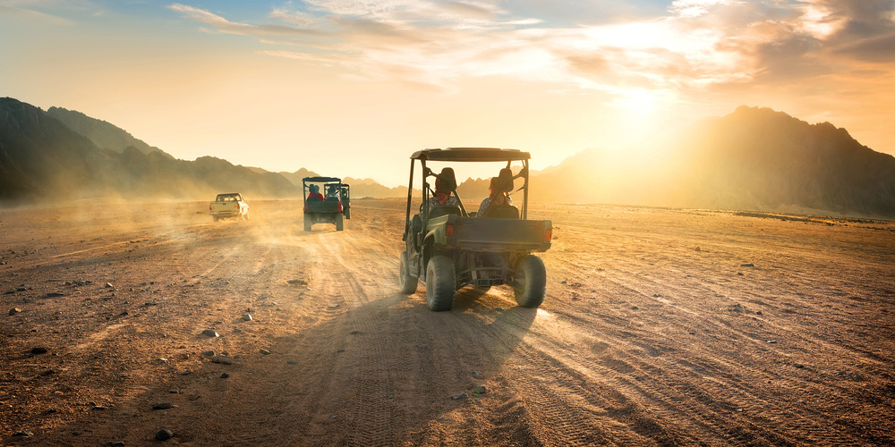 offers a thrilling hour-long ride in your own open buggy. Experience off-road adventure like never before. Choose between a single or double seater buggy and embark on an exciting journey in the Red Sea area. After hotel pickup, you'll learn how to operate a buggy before heading into the desert to visit a Bedouin village. You'll start with a test drive at the buggy station, then travel 35 km to explore the village and discover their culture and traditions. Enjoy a camel ride and watch the stunning sunset while savoring a tasty barbecue dinner, along with mineral water and soft drinks. Afterward, relax with an oriental show and traditional songs, then gaze at the stars on your return trip to your hotel in