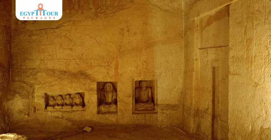 The tomb consists of two main chambers divided by pillars with a remarkable row of figures of the Queen and her family in high relief on the end wall. Another chamber with four similar carved female figures leads to a stairwell from which a lower.