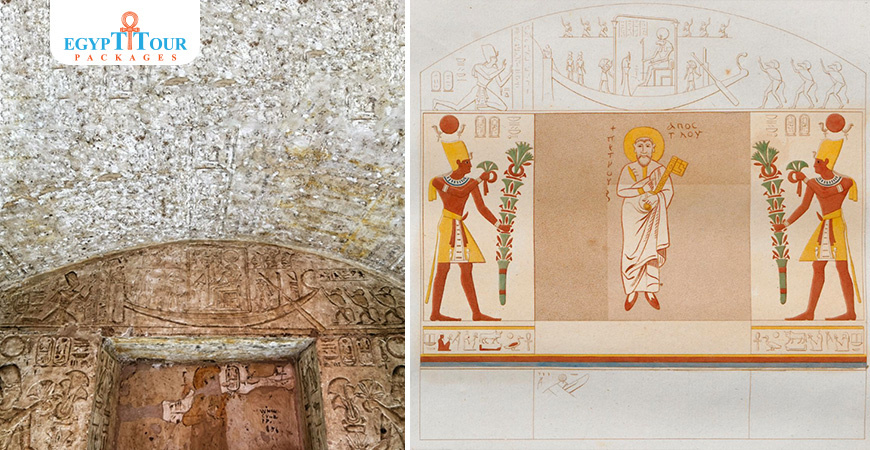 The antechamber opens into two side rooms, two side chapels and the sanctuary itself. Although the statues in the sanctuary niches were destroyed, they undoubtedly represented Amon-Re, Re-Harakhty and Ramesses II himself. in the sanctuary and associated chapels of Ramesses' temple where colourful scenes depict Ramesess adoring the sacred boats of Amun-Re and Re-Horakhty. There is also an interesting scene in the central niche of Wadi es-Sebua temple where two statues of Amun and Re-Horakhty which stood besides Ramesses II were hacked away by later Christian worshippers and replaced by an image of St. Peter. When the plaster coating was removed from the carved reliefs, one finds a bizarre image of Ramesses II offering flowers to St Peter instead.