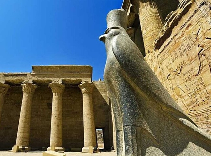 Upper Egyptian site dominated by a large well -Preserved temple, dedicated to the hawk-God Horus, The Construction of Ptolemaic temple of Horus, which was founded on the site of a much earlier temple, dated to the period between the reigns of Ptolemy the Third(246 B.c), The descriptions on the walls include the Myth of contending of Horus and Seth(Probably performed annually as a religious Drama