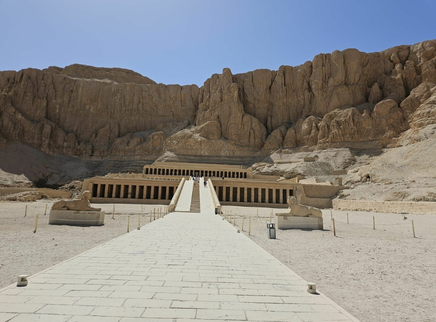 Rising out of the desert Plain, in a series of terraces, The temple of Hatshepsut Mergs with sheer limestone cliffs on the eastern face of the Theban Mountain as if Nature herself had built this Extraordinary monument.