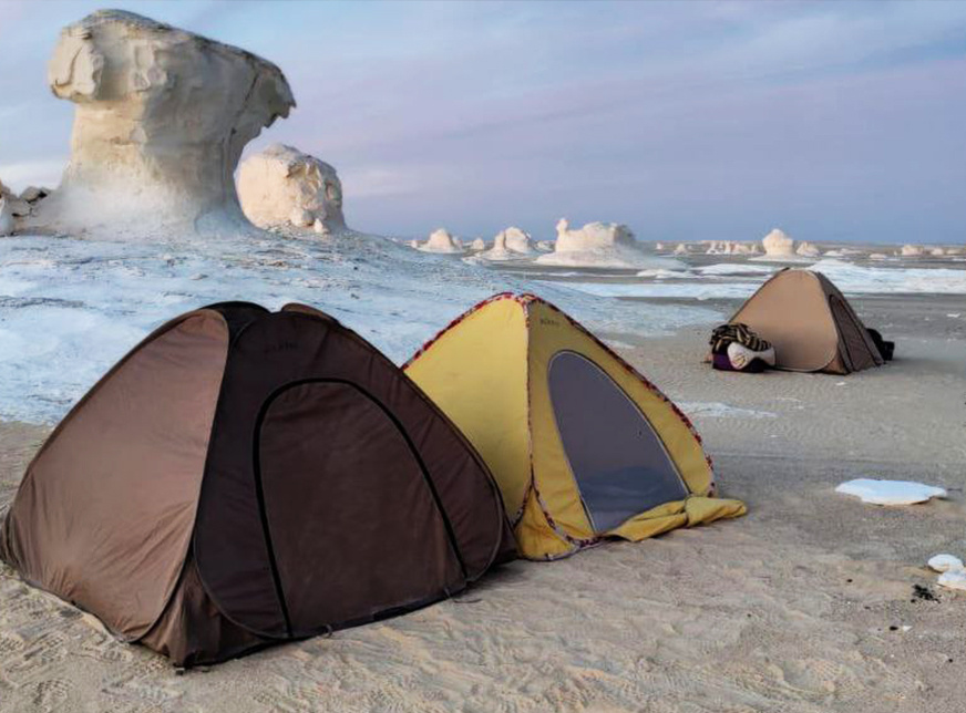15:00 Uhr Ankunft im Tal von Agabat, tief in der weißen Wüste Ägyptens gelegen. Man muss es selbst gesehen haben, um die überirdische Schönheit dieses Ortes zu erfassen. Vor Millionen von Jahren lag das Gebiet unter dem Meer. Im Laufe der Zeit entstanden einzigartige Felsformationen aus Kalkstein, Kreide (und vielleicht Sand).