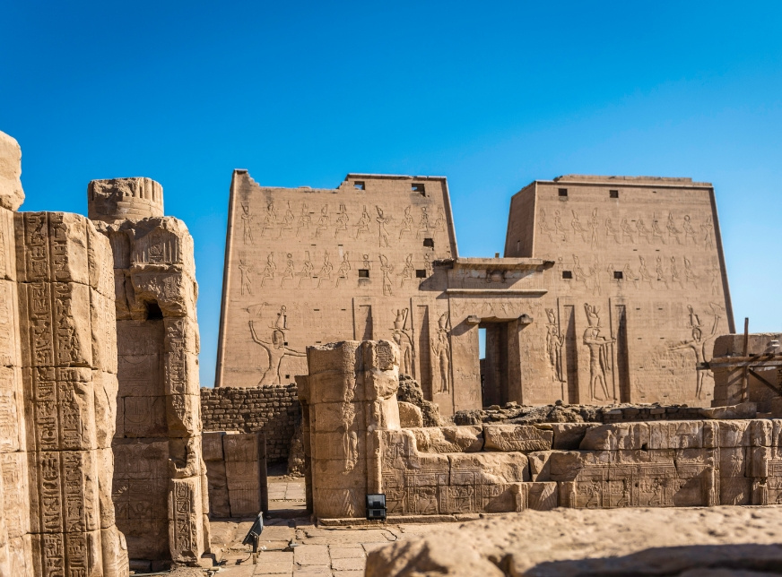 Die oberägyptische Stätte wird von einem großen, gut erhaltenen Tempel dominiert, der dem Falkengott Horus gewidmet ist. Der Bau des ptolemäischen Horustempels, der an der Stelle eines viel älteren Tempels errichtet wurde, wird auf die Zeit zwischen der Herrschaft von Ptolemaios III. (246 v. Chr.) datiert. Die Beschreibungen an den Wänden beinhalten den Mythos vom Kampf zwischen Horus und Seth (der wahrscheinlich jährlich als religiöses Drama aufgeführt wurde).