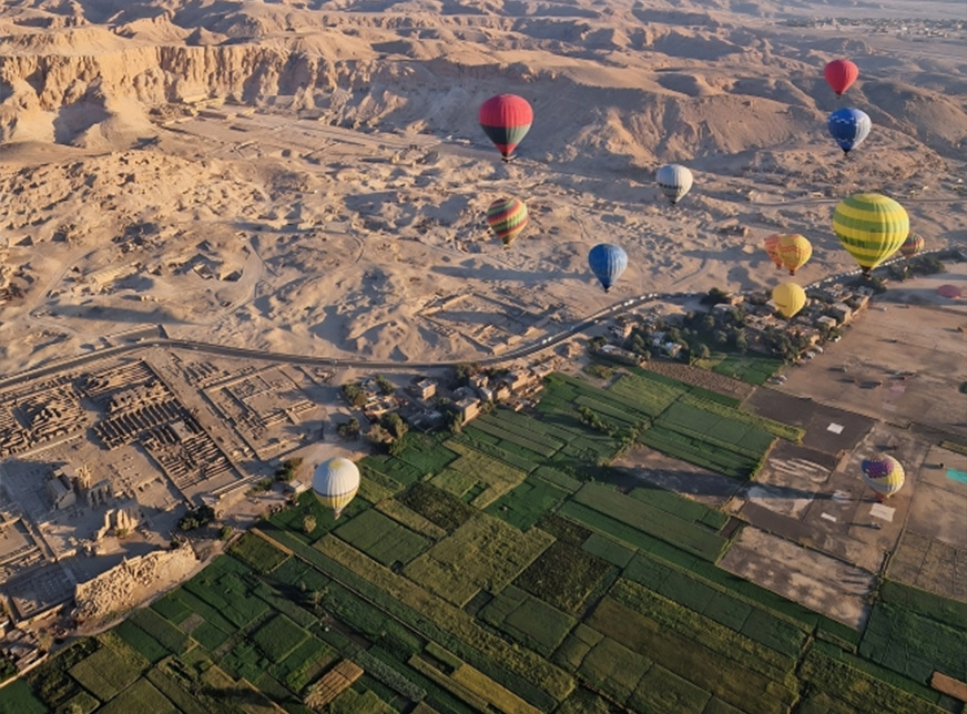 Prepare sus cámaras para un impresionante paseo en globo sobre la histórica ciudad de Luxor. Capte los rayos del sol de la mañana que iluminan la ciudad y las montañas circundantes. Obtenga una vista panorámica de los sitios antiguos de Luxor a bordo de un globo aerostático.