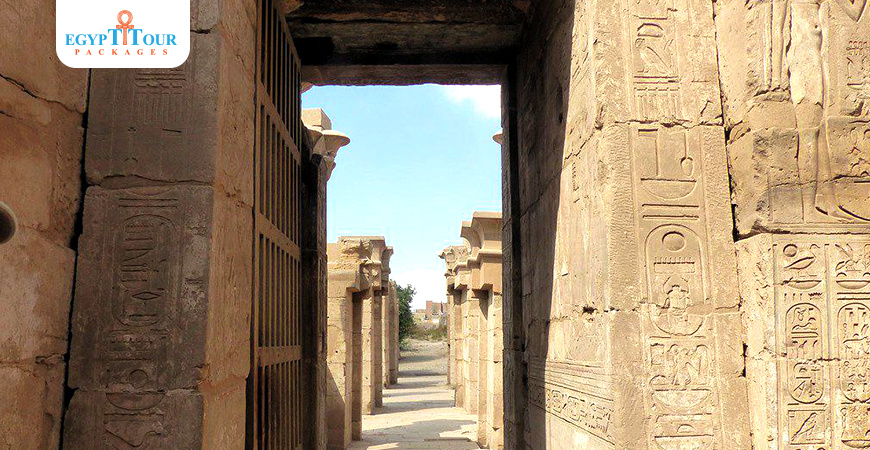- Temple de Khonsou : Sa construction a commencé avec Amenhotep III, et il a été complété par Ramsès III, IV, X, XI, puis d'autres rois, et il se compose d'un édifice, d'une cour à piliers, d'une salle à piliers, puis du Très Saint, et d'entrepôts. Le temple de Khonsou comprend une statue de "Khonsou" sous la forme d'un singe, et ses murs sont décorés de scènes de Ramsès IV. Les lieux de culte des deux côtés du temple ont des couleurs bien préservées dans des scènes montrant le roi et d'autres courtisans. Derrière le temple, il y a une petite salle pour le dieu "Khonsou" avec 4 colonnes pour chacune. Colonne 16 côtés.
