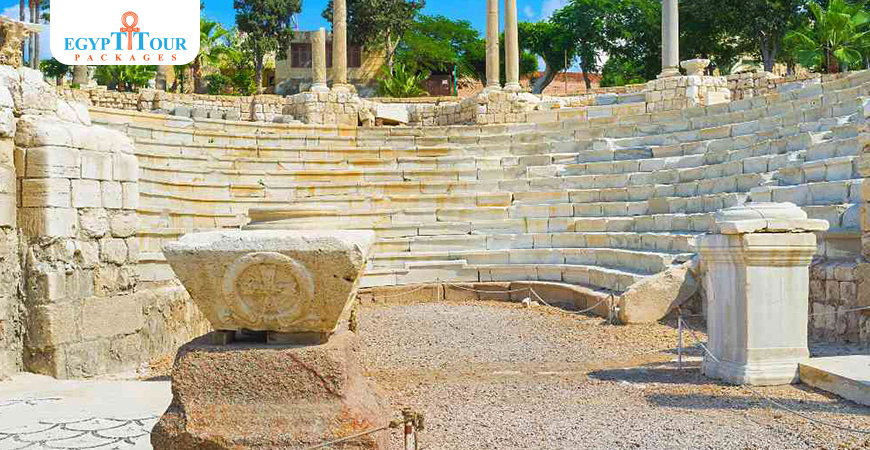 Découverte du théâtre romain Il a été découvert par hasard en 1960 par une mission polonaise lors du dépoussiérage du tombeau d'Alexandre le Grand. Il a fallu environ 30 ans pour le fouiller. La mission polonaise a continué ses recherches en coopération avec l'Université d'Alexandrie jusqu'à ce que des salles d'études soient découvertes à côté de cet amphithéâtre en février 2004.