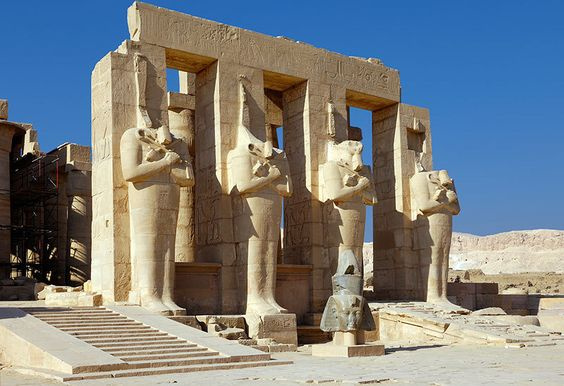 Sorgendo dalla pianura desertica, in una serie di terrazze, il tempio di Hatshepsut si fonde con le scogliere calcaree a strapiombo della parete orientale della montagna tebana, come se la natura stessa avesse costruito questo straordinario monumento.
