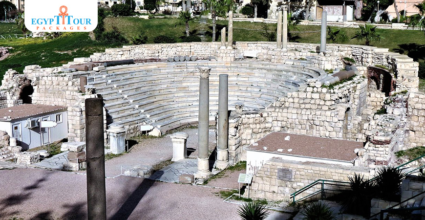 Ontdekking van het Romeinse theater Het werd in 1960 bij toeval ontdekt door een Poolse missie toen deze bezig was met het opruimen van stof voor het graf van Alexander de Grote. De opgravingen duurden ongeveer 30 jaar. De Poolse missie zette haar onderzoek voort in samenwerking met de Universiteit van Alexandrië totdat er in februari 2004 naast dit amfitheater enkele studiezalen werden ontdekt.