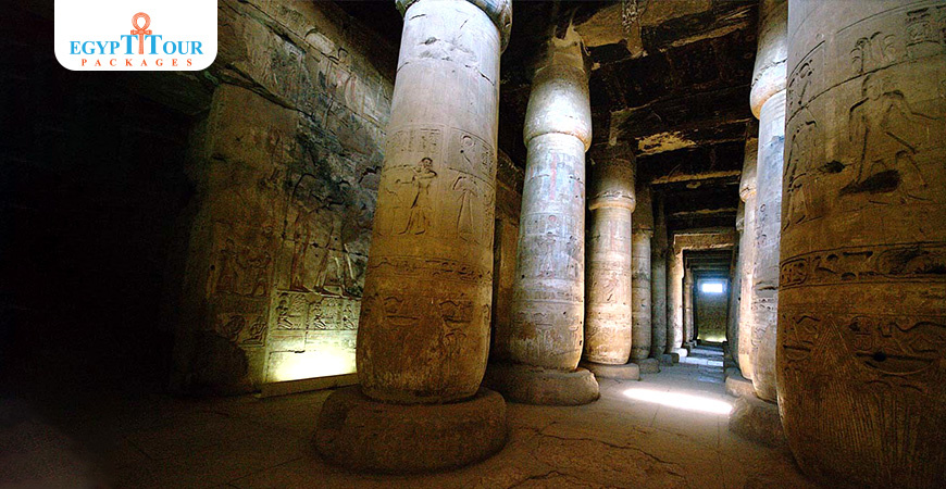 Architectonische elementen van de tempel Het grootste deel van de tempel is gebouwd van witte kalksteen en de zuilen zijn gemaakt van zandsteen, in de vorm van de letter ''L'' in tegenstelling tot de faraonische tempels die gewend zijn aan het rechthoekige ontwerp, de tempel begint met twee ruime binnenplaatsen, aan het einde waarvan er een trap is die twee hallen met zuilen bereikt, waarvan de eerste 171 voet lang en 36 voet breed is. Het omvat 24 zuilen, in de vorm van bundels papyrus, en hun kapitelen hebben de vorm van een ongeopende bloem. Deze zuilen zijn gerangschikt in twee rijen, elke rij van 12 zuilen, waarop scènes zijn gegraveerd uit verschillende aspecten van het leven van Ramses II. Eén scène toont Khnum, de god van de schepping en het water, en een tweede scène toont Ramses II, beschermd door Hathor en Isis, en een andere scène van de zuiveringsceremonie van de koning, deze zuilen vormen gangen die naar een andere hal leiden.