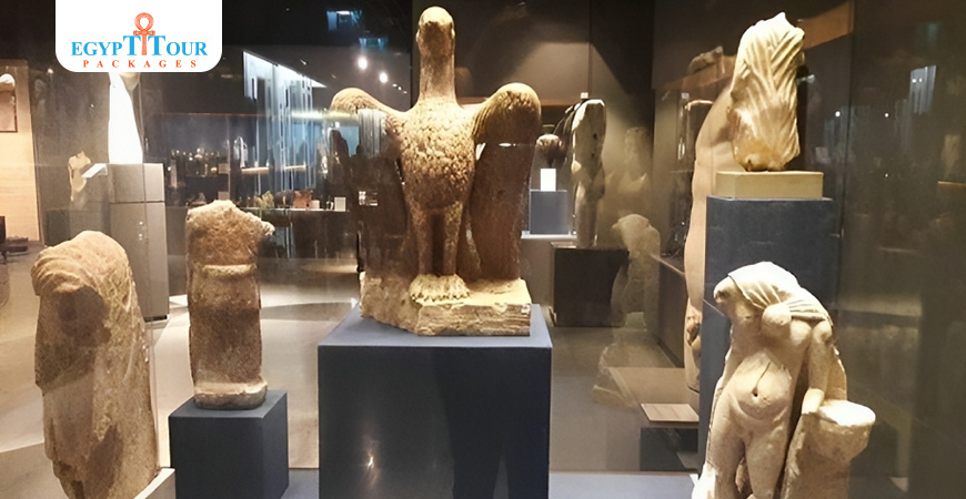 The museum includes four halls for displaying ancient Egyptian antiquities, a model hall for the ancient Egyptian cemetery, four halls for displaying Greco-Roman antiquities, in addition to a hall for displaying sunken antiquities, three halls for Coptic antiquities, two halls for Islamic antiquities, a currency hall, and another for modern-day antiquities.