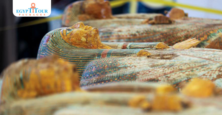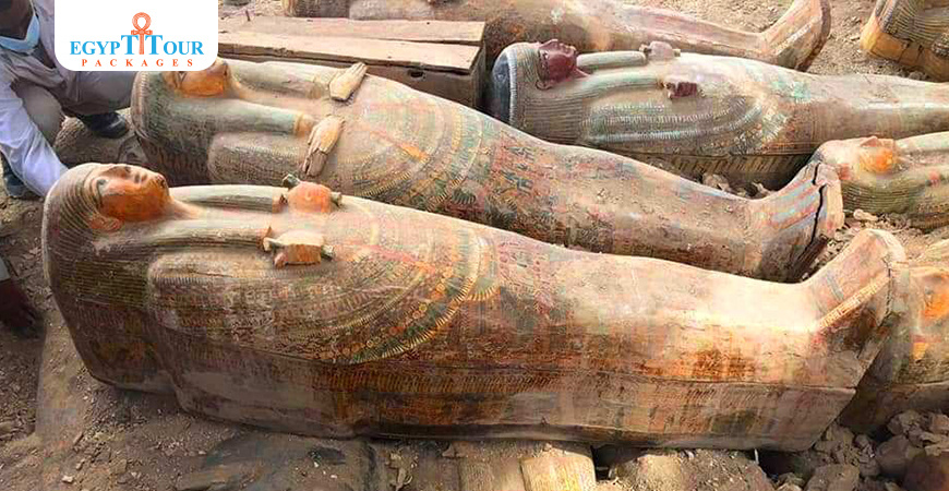 More than 30 colorful Pharaonic coffins with a mummy inside were discovered in the heart of Mount Qurna in the Asasif cemetery on the western mainland of Luxor on October 2019 AD. All the coffins are colored and retain their colors and decorations until now, including a group whose Pharaonic decorations are not complete. All the Pharaonic coffins were opened and it was discovered that they were of priests and priestesses, in addition to children, to worship the god Amun and Khonsu. The age of the coffins dates back to 3000 years BC. The mummy was kept inside each coffin, then 12 coffins were assembled on the first level, then 18 coffins on the second level on top of each other, then the workers buried them inside their own tombs. The discovery was made by the Egyptian mission excavating the archaeological area. Each coffin has a text in the ancient Egyptian language bearing the name of the owner of the coffin and his job. Many archaeologists believe that the period of the spread of tomb thieves is the period that made the ancient Egyptians make coffins as a tomb to protect the mummy from theft. All the coffins are currently being restored until they are fully displayed in the grand Egyptian Museum, one of Cairo’s distinctive tourist attractions.