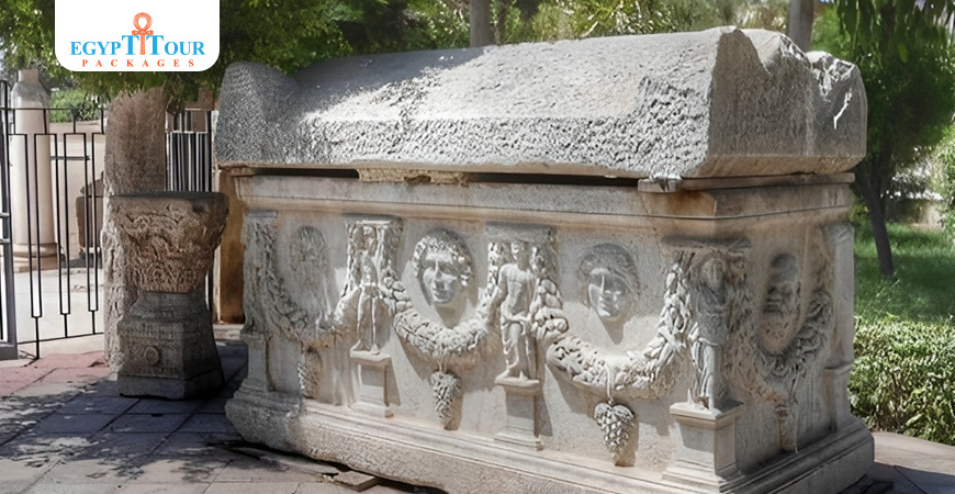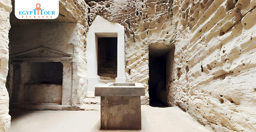 . This name was given to it in revival of the ancient Greek name “Lokos Keramaikos.” Kom el-Shuqafa is located in the area where the village of Rakotis was established, which is the name by which it was known to the Romans and in revival of the ancient Pharaonic name.ra-gadit as mentioned in a hieroglyphic inscription from the reign of Ptolemy I. Excavations were carried out in the Kom el-Shoqafa area in 1892, but a hole in the ceiling of the cemetery was discovered by chance in 1900 AD. The cemetery is of the catacomb type, which is a type of cemetery that spread in the first three centuries AD, and the catacomb cemetery is the main cemetery in the Kom el-Shoqafa area and bore this name due to Due to the similarity in layout between them and the Christian Catacomb cemeteries in Rome, the name Catacomb is a term given to the tombs dug under the surface of the ground.