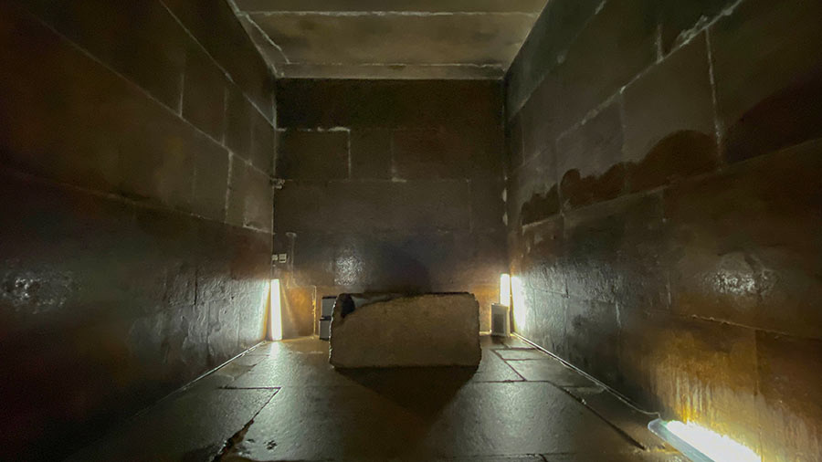 King Khufu's room in the pyramid is the only room from the Fourth to Sixth Egyptian Dynasties that has a flat roof and not a gabled roof. There is a granite sarcophagus west of the room. Cover not found. The sarcophagus is made of a single piece of stone. It was placed in place at the time of construction before the roof was installed.