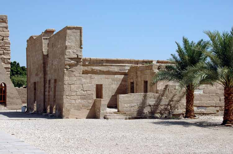 These shrines were built for the 'God's Wives of Amun', or 'Divine Adoratrices', king's daughters of the Third Intermediate Period who were Amun's living consorts and lived unmarried in ceremonial splendour. They were representatives of royal power, visible symbols of Theban loyalty to the king who lived in the north. The chapels belonged to Amenirdis I, Nitokris, Shepenwepet II and Mehytenweskhet. The funeral chapels of the Divine Adoratrices of Amun are situated in a small building in the south-eastern part of the space preceding the first pylon. In the course of the Intermediate Period and in the period of the 25th and the 26th Dynasties, certain Divine Adoratrices of Amun were worshiped. The Divine Adoratrices of Amun ruled upper Egypt, at least nominally, on behalf of the King during this period of Egyptian history. These were the royal princesses and princes enjoying great prestige and representing the King in the area around Thebes - such as Amenirdis (sister of Shabago), Shepenwepet (daughter of Osorkon III) and Nitocris (daughter of Psamtek I) were all buried within the Ramesseum.Since the day Ahmose, first Pharaoh of the 18th dynasty had first made his wife Ahmose-Nefertari the god’s wife of Amun at Karnak. At this remote time Ahmose-Nefertari, the god’s wife, wasn’t the Divine Adoratrice. It would be several centuries before the God’s wife took the office of the “adoratrice of the god” and combined it with her royal office. Until that time this secondary office for women in the Temple of Amun at Karnak, was held by well-born noble women. The God’s Wife position was a priestly office at first held by non-royal ladies of the Middle Kingdom. From the reign of Ahmose-Nefertari onwards it would be an office held only by women of the royal house. Ahmose endowed the position with lands and entitlements, making it a wealthy position as well as a religious office. During Ahmose-Nefertari’s occupation of the office, its title "the God’s Wife appears" to be the title she preferred over the usual titles. She was entitled to use such as "King’s Wife", "King’s Principle Wife", or even "King’s Mother".