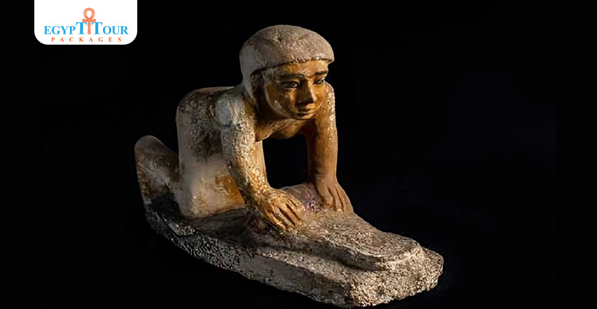 The servant statue represents a man grinding grain. In ancient Egypt, bread was an essential food for both the living and the dead. Many servant statuettes found in tombs were involved in the bread-making process, including kneading dough and baking bread. However, grinding the grain was the first step in this process. This figurine symbolizes the importance of ensuring a constant supply of bread for the deceased in the afterlife.