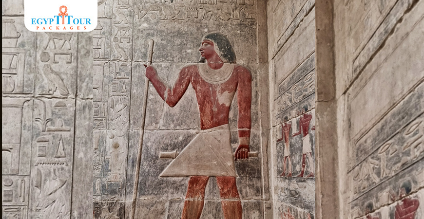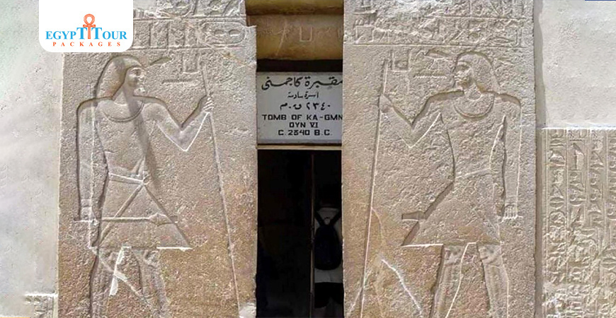 The tomb is located east of and adjacent to the Mari Roca cemetery, and its door opens to the east. The mastaba consists of seven rooms, most of which are rectangular in shape, all of which are engraved in relief. Some of their views are excellent. Lepsius uncovered the Kagmeni tomb in 1843, but he was unable to publish it.The tomb was covered with sand for a period of fifty years, and the Antiquities Service re-cleaned the tomb in 1893. De Morgan participated in the cleaning process, and Loret also participated in cleaning and preparing the tomb and others for public visitation.Von Bissing came from the Saqqara region and attempted to publish parts of the tomb from Room 4 to Room 8 in two parts in the German language between the years 1905-1911. Then the Saqqara Koppel region came and carried out cleaning and excavation work around the Kagmeni cemetery in the years 1905-1907. Excavations and cleaning of graves stopped from 1914-1920 due to World War I.In the fall of 1920, financial funds became available to archaeologists, and archaeological work resumed activity and he came to the Saqqara Firth area. He carried out some excavations in the Cemetery of Teti for a few years, re-excavated this cemetery and published parts of this cemetery in five pages and 6 pictures in a two-part book.Then Harpur recently studied the details of the cemetery’s landscape in a very valuable and useful study which added much, much more, and was distinguished by distinctive cultural comments.