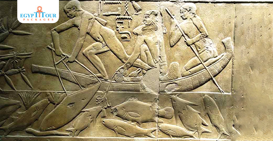 Another chamber, accessed through a doorway in the north wall of the pillared hall, is adorned with fishing scenes on its right-hand wall. In these scenes, crocodiles and men compete to catch fish and battle with hippos, creating a sense of danger. On the opposite wall, there are depictions of tending animals, such as feeding hyenas, caring for birds in a poultry-yard, and force-feeding geese. This chamber leads to another room on the left, where scenes of food offerings, granaries, and men dragging plumed chests on sledges can be seen. These scenes appear to be part of a harvest festival.