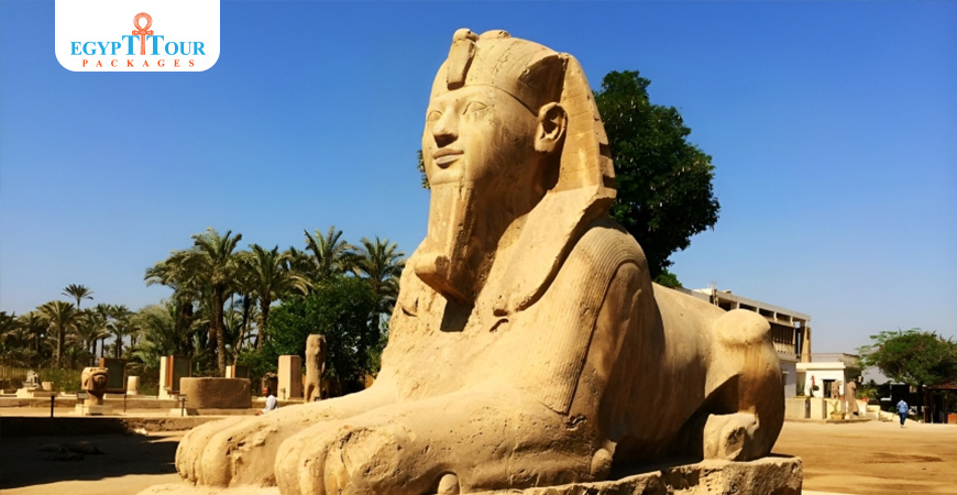 The modern museum building houses an impressive statue lying on its back. This colossal limestone statue of Rameses II is a twin to the one that used to stand in the center of Midan Rameses in Cairo but has been relocated to Giza. Although it is only a fragment, the statue measures nearly thirteen meters even without its lower legs. It was originally placed outside the Temple of Ptah at Memphis was one of the oldest and most important cities in ancient Egypt, located at the entrance to the Nile River Valley near the Giza plateau. Memphis . The museum also showcases other statues of Rameses II, including a red granite one that was previously located behind the museum but has now been placed at the eastern end of the garden. Another notable monument in the museum grounds is a massive limestone (or 'alabaster') sphinx from the New Kingdom era.