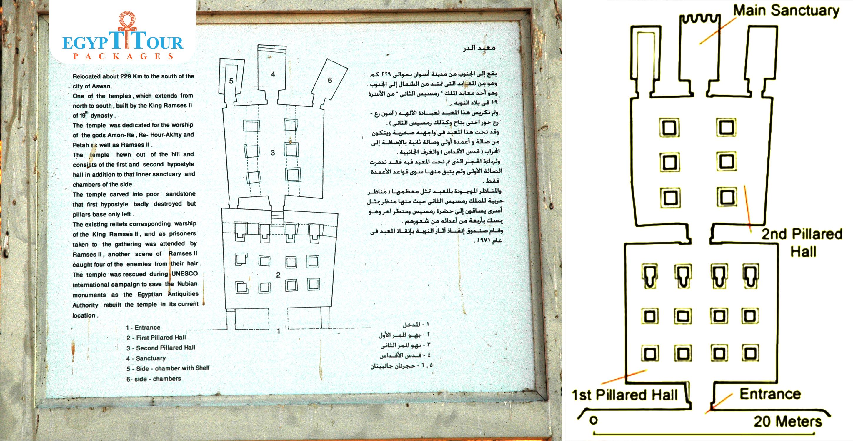 , temple cut into the rock was commissioned by the great 19th Dynasty king Rameses II. Its ancient Egyptian name was ‘The Temple of Rameses the Beloved of Amun in the Domain of Ra’. Essentially consisting of two pillared halls and terminating in a sanctuary, it has several interesting similarities with the most famous of Rameses II’s rock-cut temples, the Great Temple of Abu Simbel. Here too in the temple of al-Derr, the figures of the same four gods can be seen in the sanctuary, cut into the rock: Ptah, Ra-Horakhty, the deified Rameses II, and Amun-Ra. This Temple is located 208 KM south of Aswan, it was moved to a new location close to Amada temple.