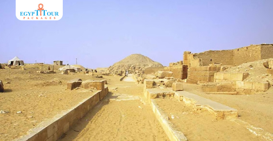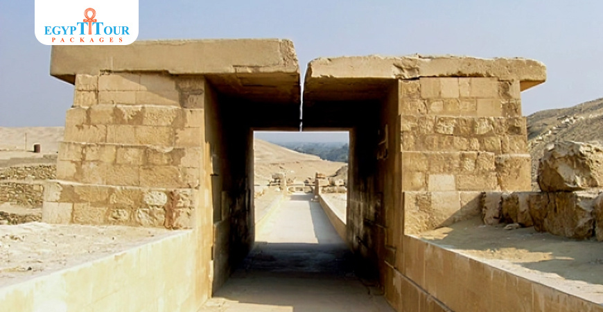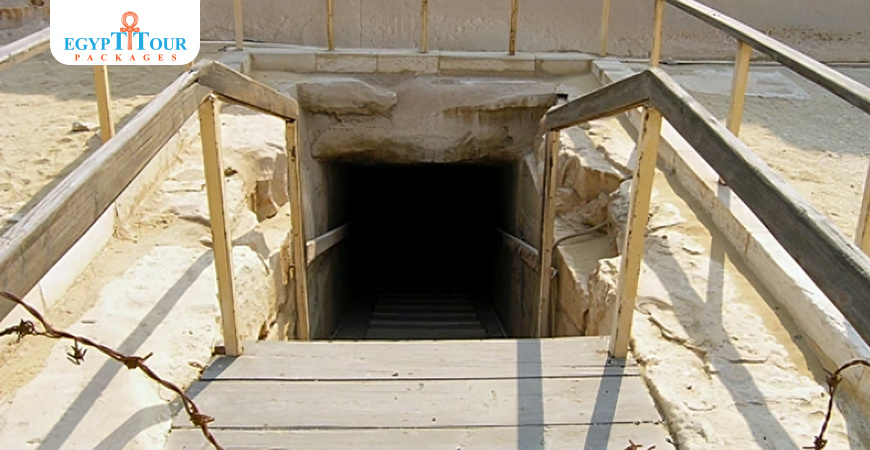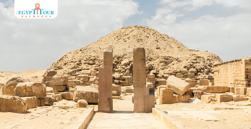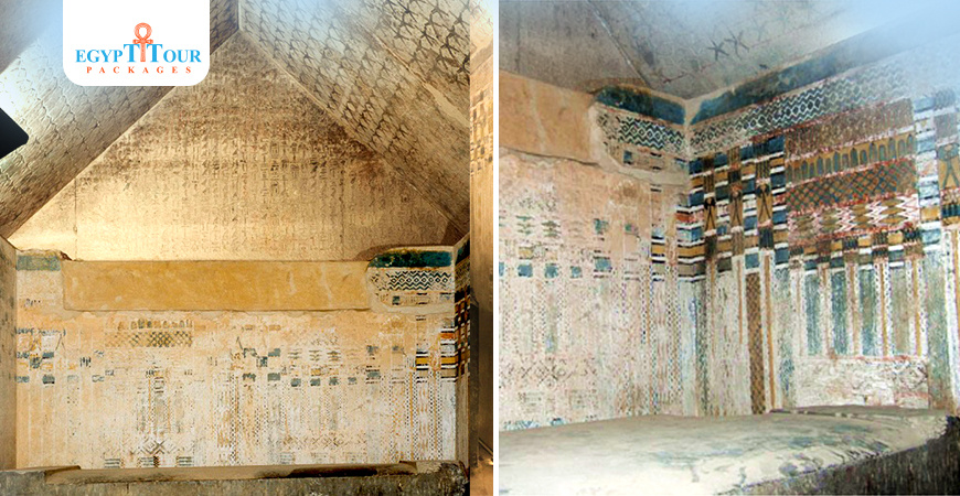 The pyramid itself appears ordinary, just a large pile of rubble overshadowed by the Saqqara step pyramid is an archeological remain in the Saqqara necropolis that is located northwest of the city of Memphis was one of the oldest and most important cities in ancient Egypt, located at the entrance to the Nile River Valley near the Giza plateau. Memphis in Egypt . Step Pyramid of Djoser . Gaston Maspero was the first to explore the structure in 1881, after studying texts from other pyramids of the same era. Alexandre Barsanti excavated the pyramid and part of the mortuary temple in the early 20th century, followed by Cecil Firth, Jean-Philippe Lauer, and others. The pyramid's core was made of rough limestone blocks that decreased in size towards the top. It was covered with fine white limestone blocks, which are now only present on the lower levels. The entrance to the pyramid was located on the north side, opening at ground level in the court beneath a small entrance chapel. A passage led to a corridor and horizontal passage, originally blocked by three granite slabs. The antechamber was situated beneath the center of the pyramid, with a room containing three niches to the east and the burial chamber to the west. The burial chamber's roof was gabled, and its ceiling was painted with golden stars on a deep blue background, representing the night sky. The walls of the burial chamber were lined with white alabaster, featuring intricate designs in black, white, yellow, blue, and red, imitating the wooden structure covered by reed wall hangings of a royal palace or a niched archaic mastaba. Notably, Unas was the first king to have texts inscribed on the walls of his final resting place.
