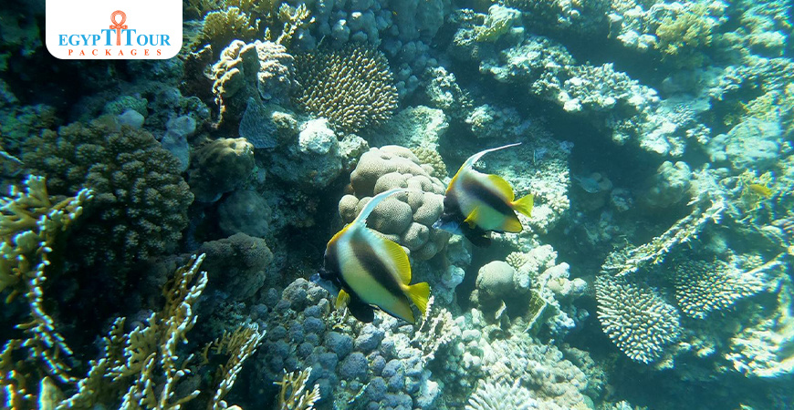 . Discover crystal clear blue water of the Red Sea, lagoons, and colorful coral reefs. You will be picked up from your hotel at approximately 8.00 am and then drive to the marine jetty where you will get on the boat. Sail for 45 minutes by boat towards the east of