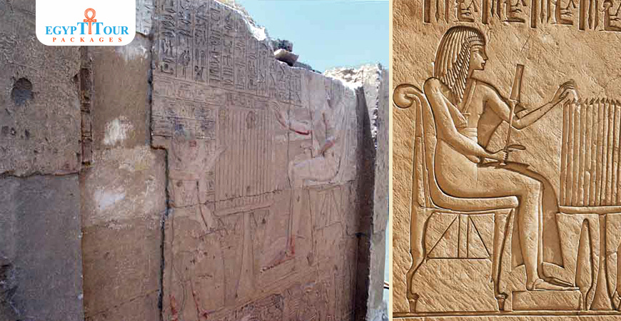 On the south wall of a small vestibule, to the east of the statue room, one finds a fine well preserved and nearly complete relief showing an anonymous priest making the ritual of 'Opening of the Mouth' on a seated statue of Horemheb. A small character represented behind Horemheb named (Sementaui) seems to have been a particular favorite scribe of Horemheb for a long time. After the death of Sementaui he was here replaced by another, (Ramose), whose name has been engraved over that of his predecessor. The actual statue room is a large oblong, once covered by an arched roof whose ancient collapse has caused the disappearance of the ancient paintings which had been made directly on the plaster. Inscriptions written on the jambs of the entry give interesting information. On those of the east, one finds Horemheb represented before a table of offerings. Only on one of the two representations does he wear an uraeus on the forehead, added after his accession to the throne.