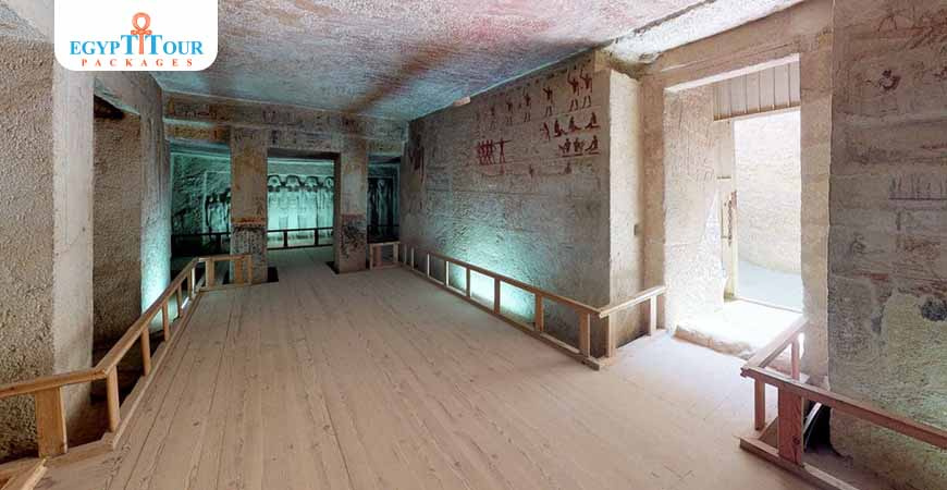 The tomb consists of two main chambers divided by pillars with a remarkable row of figures of the Queen and her family in high relief on the end wall. Another chamber with four similar carved female figures leads to a stairwell from which a lower.