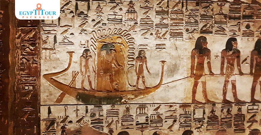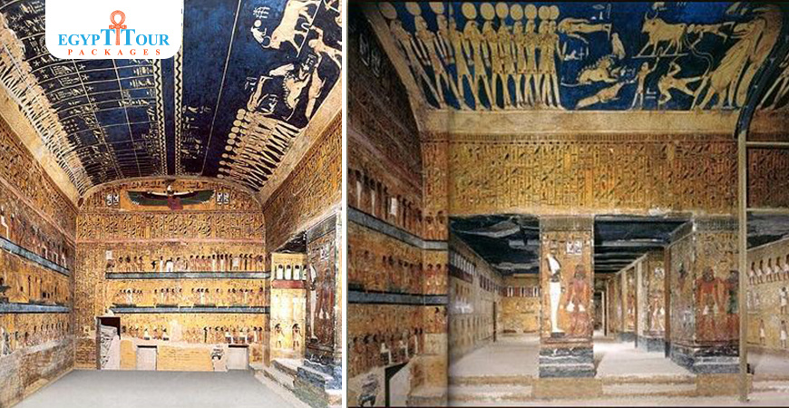 It is noted in the second axis that one of the side rooms in the burial chamber, which is the second room on the left of the interior, is characterized by the presence of shelves, on which it is possible that some statues or precious items of funerary furniture were placed. As for the texts and views, we can see what is new on the walls.The cemetery, as we find on its walls long solar hymns, hymns directed to the Eye of Horus and the story of the destruction of humans.This is in addition to what was known before, such as the Book of Gates and the Book of “Umi Dawat.” As for the views, the most famous are the astronomical views of the constellations, stars, and planets recorded on the vaulted ceiling of the burial chamber. It is also noted here the transition to the inscription of the scenes that we saw before in the cemetery of Horemheb. And here it has become a fact that can be traced in most of the views of Seti I, as most of the views of the tomb of Seti I are engraved in relief and colored in bright colours, although there are some themes where we see only the outer lines of some of the scenes, but the drawings have their value, given that they show We have the methods by which these wonderful works of art could be brought out in the darkness of these rooms carved into the rock of the mountain.