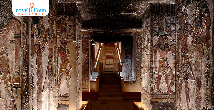 . It extends 130 meters long and 30 meters deep into the rocks of Mount Qurna, which includes hundreds of tombs and dozens of Pharaonic temples, west of Luxor.The tomb of King Seti I (No. 17) in the
